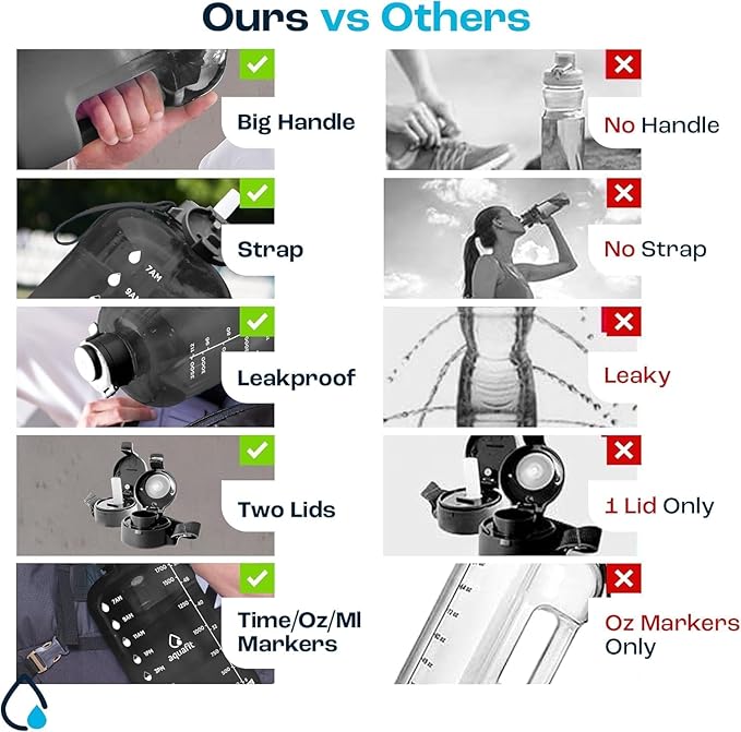 • Track how much you drink – Our half gallon water bottles come with clear time markers on the side so you can see your daily water intake and stay on track to meet your health and fitness goals.