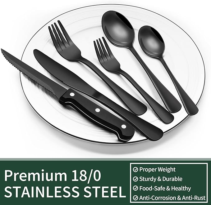 EWFEN 24-Piece Black Silverware Set with Steak Knives, Flatware for 4, Food-Grade Stainless Cutlery Set